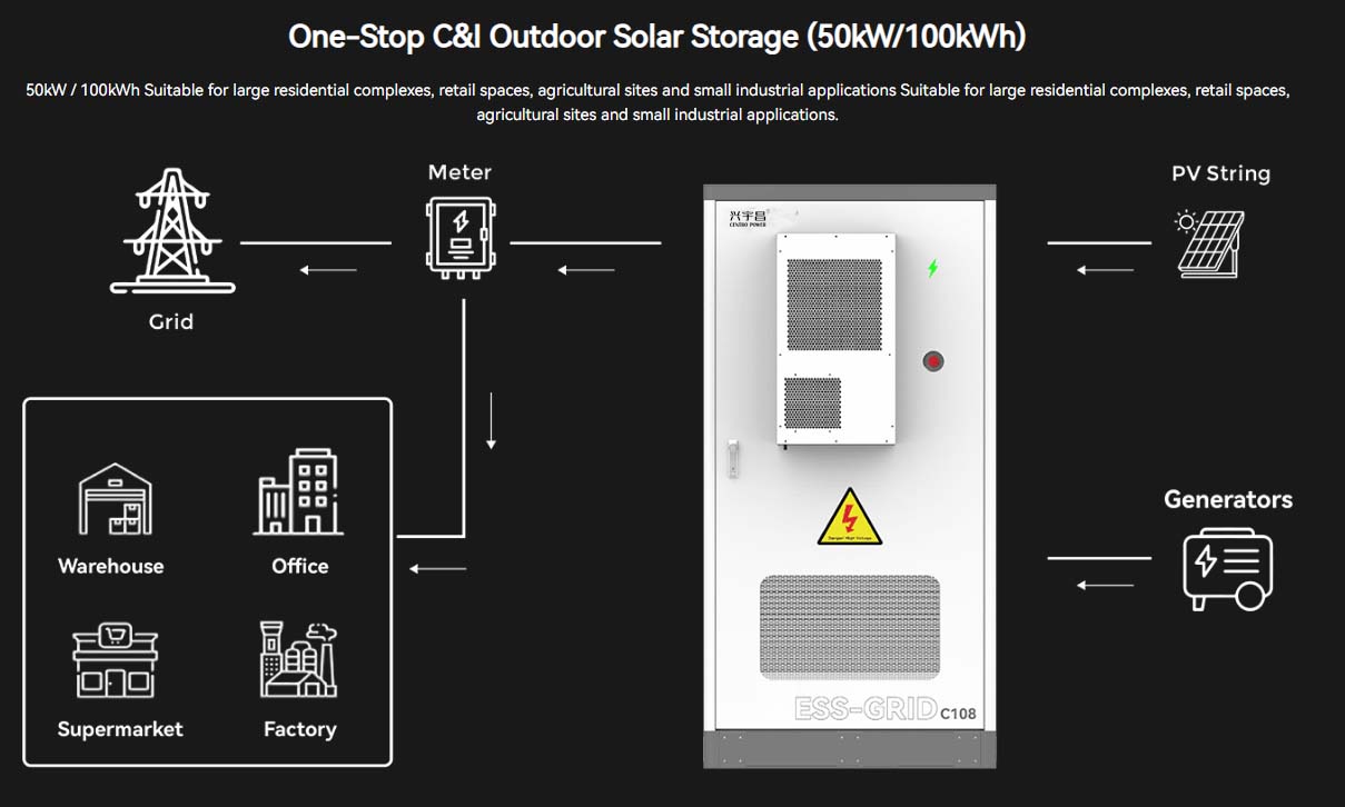 Introducing our 50kW / 100kWh high-voltage outdoor energy storage solution designed for commercial and industrial (C&I) applications. This system uses advanced and safe lithium iron phosphate (LiFePO4) battery technology to provide you with reliable, efficient and long-lasting energy management capabilities, making it an ideal choice for optimizing solar energy utilization, reducing operating costs and improving energy resilience.